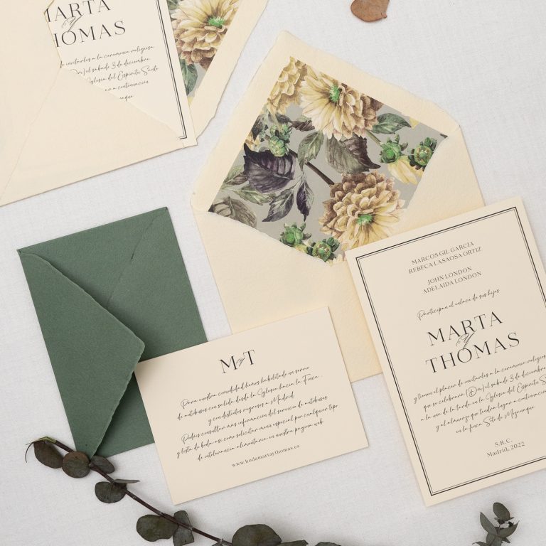 Por otro lado, algunas de las parejas que ya nos han elegido como su imprenta de invitaciones de boda en Madrid optan por realizar un diseño mucho más personal incluyendo detalles que les representen como pareja. Se trata de adaptar lo máximo posible la celebración para crear un día singular e irrepetible. En nuestra tienda de invitaciones de boda en Madrid nos encanta ayudar a las parejas a llevar al papel la idea que tienen en mente, así que no dudes en proponernos un diseño en concreto que te guste.